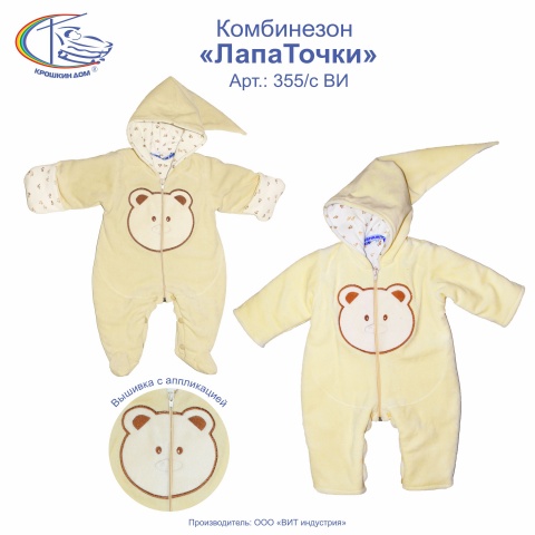 Теплый трехслойный комбинезон из серии «ЛапаТочки» для маленького тигренка или львенка, медвежонка, котенка, зайчонка…- выбирайте сами, чья лапка отпечаталась по всему комбинезончику! С утеплителем и подкладом, с капюшоном «гномик», на разъемной молнии спереди и кнопках между штанинами для удобства одевания ребенка на прогулку и смены памперса. Закрытые ножки закрывающиеся кисти рук в размере 18,20. Мягкие манжеты «на вырост» на рукавах и на штанинах в размере 22,24. Объемная двудольная вышивка-аппликация на груди. Состав: верх – велюр, подклад - трикотаж интерлок - хлопок 100%. Наполнитель: синтепон Размер: 18-24 Цветовая гамма: экрю, лапки, совмещение компаньонов по цвету. Упаковка – пакет ТМ Крошкин дом. Производитель: ООО ВИТ индустрия