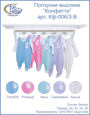 Мягкие, эластичные велюровые высокие ползунки-полукомбинезон с застежкой на кнопки на плечах с декоративным элементом на груди. Отлично смотрятся с боди арт. Кф-016/3 И или кофточкой арт. Кф-010/3И из этой же коллекции. В ветреную погоду оденьте сверху Жакет-спенсер арт.703 ТИ из пушистоговелсофта на трикотажном подкладе.