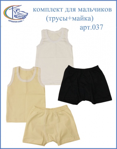 "Комплект трусы+майка для мальчика. Майка на широких сонаправленных к горловине бретелях, исключающих их спадание с плеча. Трусы типа «боксеры» с выделенным гульфиком, обработка «плоский шов».